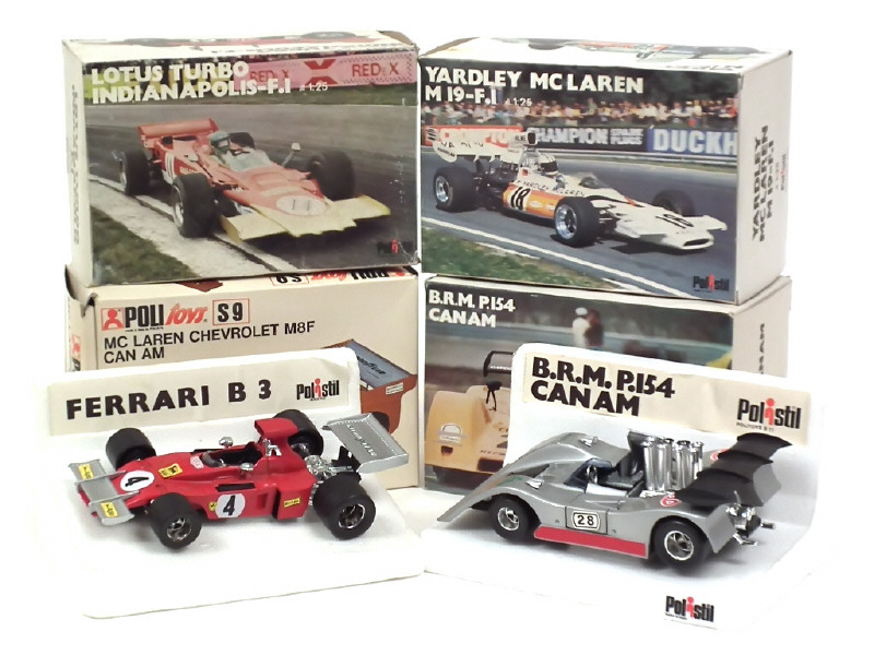 échelle 1/25ème - comprend : Mc LAREN CHEVROLET M8F CAN AM, BRM P54 CAN AM (2 exemplaires identiques), LOTUS TURBO INDIANAPOLIS, FERRARI B3 & Mc LAREN 'YARDLEY' M19