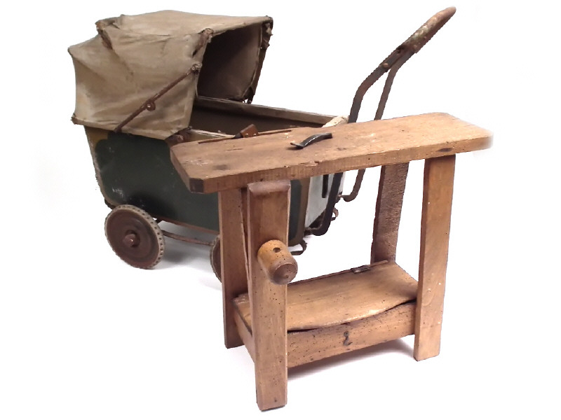 années 30 - dimensions : 77x33x59 cm - importantes traces d'oxydation - toile de capote incomplète - on y joint un établi en bois pour enfant avec une équerre (état 'D', vermoulu)