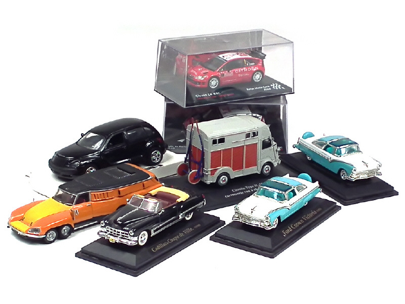 comprend : CITROEN PLR, 1200 KG van à chevaux, C4 WRC (2 exemplaires différents), FORD CROWN VICTORIA (2 exemplaires identiques), CHRYSLER PT CRUISER & CADILLAC cabriolet - on y retrouve notamment les marques : NOREV & NEW RAY - 2 véhicules avec boîte - quelques petits manques - carrosseries encrassées
