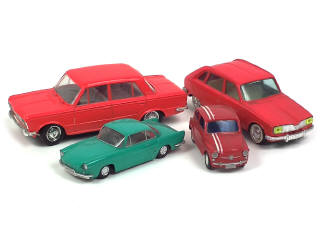 différentes échelles - comprend : SEAT 600 F, RENAULT CARAVELLE (roues, axes & fixations de plancher non d'origine), 16 (jantes légèrement fondues) & FIAT 125 (manque autocollant de plaque minéralogique arrière) - on y retrouve les marques : MARCHESINI, JYESA (un plancher avec traces d'oxydation) & VERCOR - 3 véhicules avec moteur à friction (fonctionne) & un autre avec moteur à piles (à revoir)