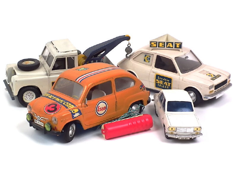 différentes échelles - véhicules motorisés (3 fonctionnels) - comprend : SEAT 127 'SEAT' (manque un autocollant de plaque minéralogique), LAND ROVER dépanneuse 'SEAT', SEAT 600D téléguidée (un élément de direction manquant) & FASA-RENAULT 12 (plancher légèrement déformé) - quelques manques sur les décalques