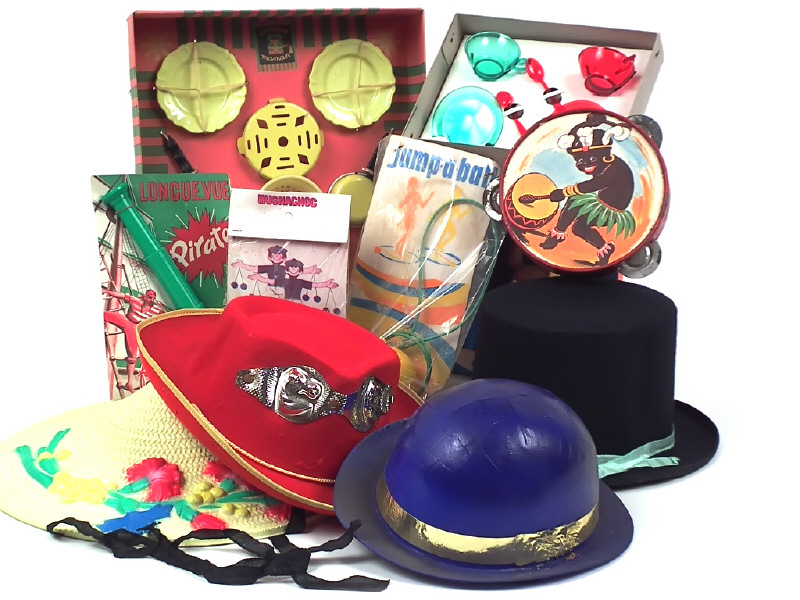 comprend notamment : chapeaux (différentes matières), ardoises d'écoliers, dinettes, tambourin, etc ... - possibilité de petits manques