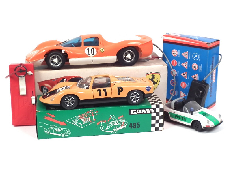 différentes échelles - comprend : PORSCHE CARRERA 10 (moteur à friction fonctionne), PORSCHE 911 'POLIZEI' téléguidée (moteur à piles fonctionne, avec gyrophare & direction) & FERRARI télécommandée (avec notice, moteur à piles à revoir, échelle 1/10ème) - on y retrouve les marques : GAMA, HUKI & ELLEGI - blisters incomplets