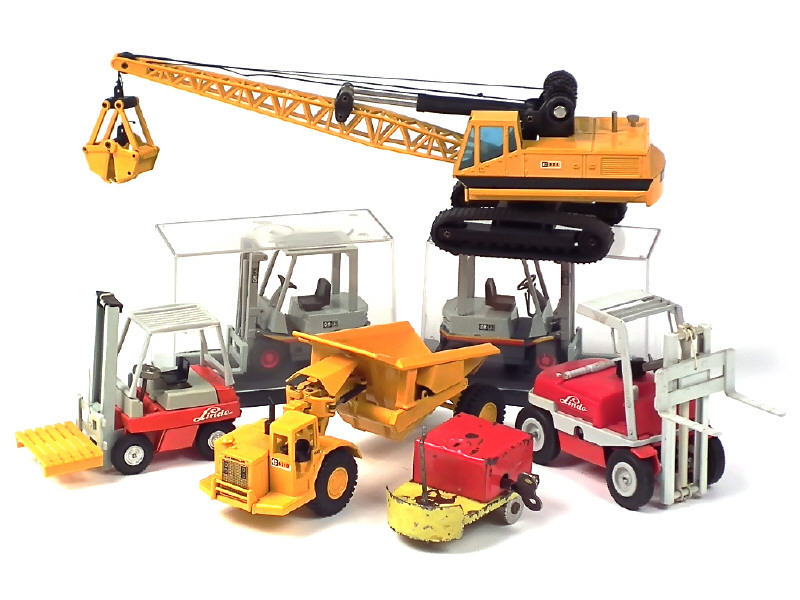 états de 'A' à 'C' - comprend : CATERPILLAR 231D DUMPER articulé, 225 grue avec pelle preneuse sur chenilles, LINDE chariot élévateur (2 exemplaires différents) & OM chariot élévateur (2 exemplaires identiques avec boîtes en état 'b') - on y retrouve notamment les marques : OLD CARS, JOAL & GAMA - on y joint un chariot de gare de la marque LA HOTTE SAINT NICOLAS en état 'E' - petits manques & parties cassées sur 3 modèles