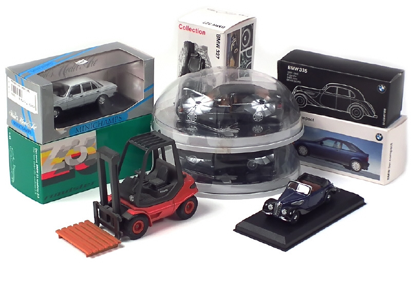 comprend : LINDE FENWICK (sans boîte, carrosserie poussiéreuse), MERCEDES 230E (boîte état 'c') & 600SEL, BMW 327, 335, Z3, 3ème série & 7 ème série - on y retrouve notamment les marques : MINICHAMPS, GAMA, CHABAK & SCHUCCO