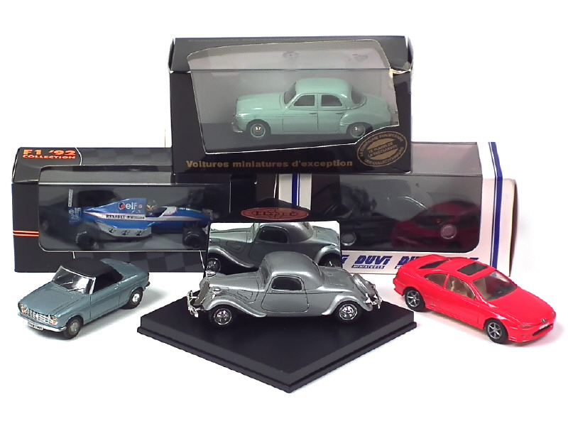 comprend : CITROEN, LIGIER, PEUGEOT (204 & 406) & RENAULT (FREGATE & 21(pneus coupés)) - on y retrouve les marques : DUVI, ELYSEE, CEC, GTS & ONYX - petits manques - on y joint une boîte vide (état 'b' de la marque DUVI)
