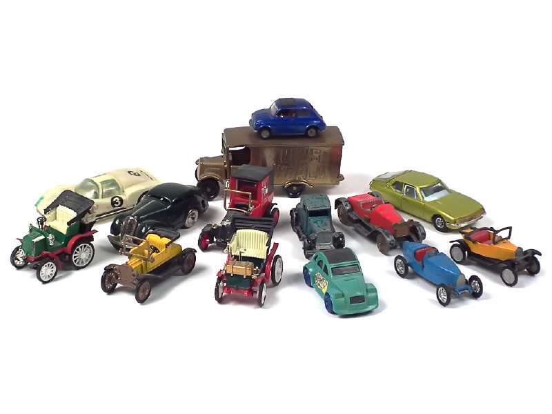 états de 'B' à 'F'- miniatures reproduisant notamment les modèles : CITROEN, PORSCHE, FORD, BUGATTI & FIAT- on y retrouve les marques : SAFIR, JMK, CORGI TOYS, SCHUCCO, MEBETOYS & TOOTSIE TOYS - petits manques - carrosseries poussièreuses