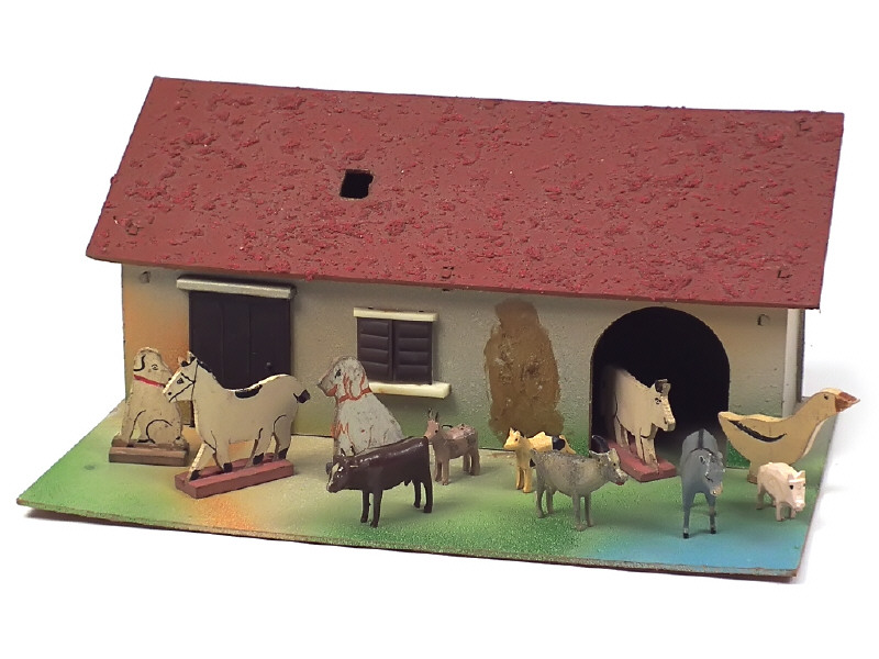 dimensions : 40 x 26 x 17 cm - on y joint 11 animaux en bois (fabrication de 1900 à 1950, avec petits manques) - manque cheminée