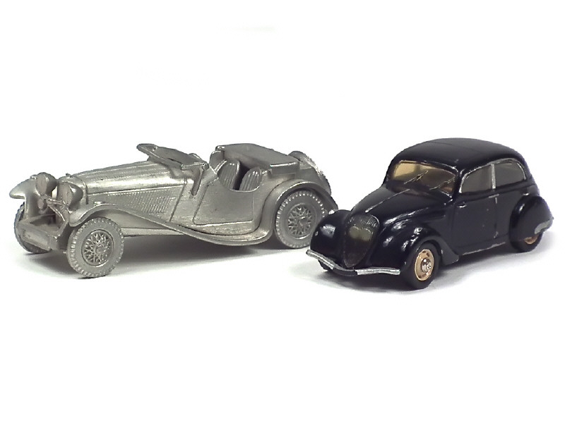 comprend : PEUGEOT 202 (en état 'D', avec éclats majeurs sur le toit) & JAGUAR SS100 1938 (en état 'A')- on y retrouve les marques : AMR & MATCHBOX