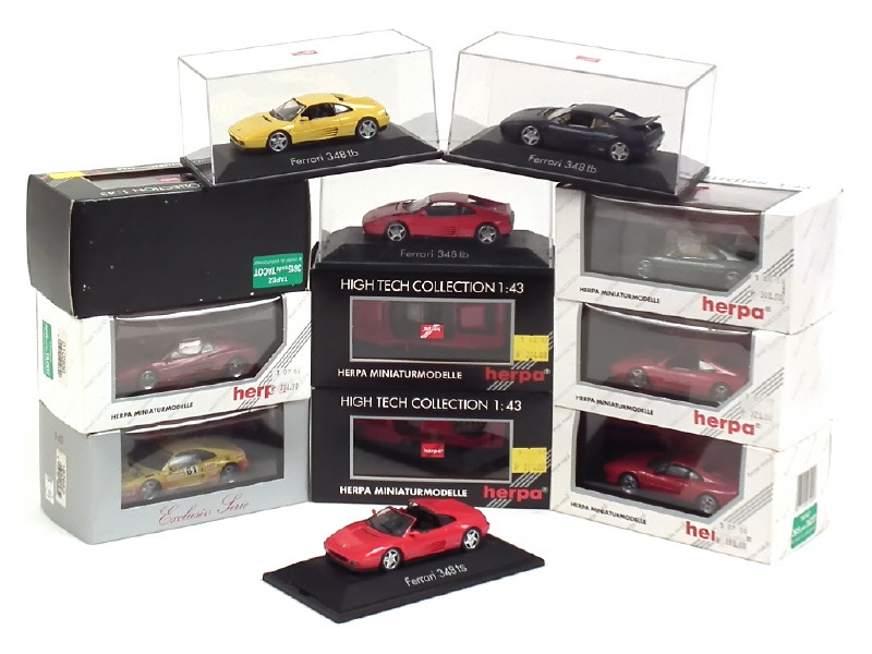 miniatures reproduisant les modèles : TESTAROSSA (2 exemplaires différents), F40 (2 exemplaires différents), 288, 348 CHALLENGE, 348 TB (3 exemplaires différents) & 348 TS (2 exemplaires différents, dont un avec suremballage manquant)