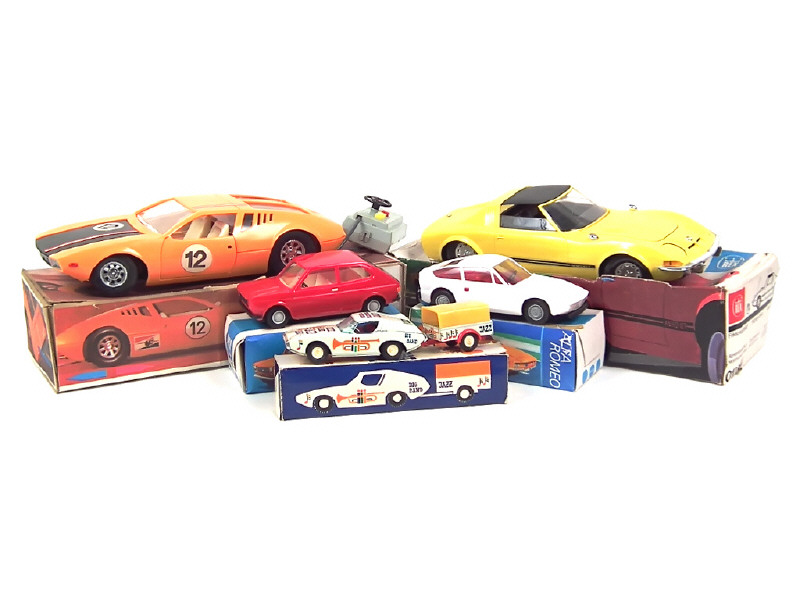 différentes échelles - comprend notamment : FIAT 127 (moteur à friction fonctionne), ALFA ROMEO 1300 JUNIOR ZAGATO (moteur à friction fonctionne), DE TOMASO MANGUSTA (téléguidée non testée avec notice) & OPEL AERO GT (moteur à piles non testé, une petite partie cassée sur le train arrière) - on y retrouve notamment les marques : PIKO, REX & EHRI - boîtes déformées