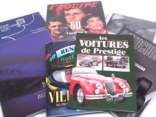 comprend : L'EQUIPE 50 ans DE FROMULE 1 (2 livres en coffret sous film plastique jamais ouvert), MATRA, AUTOCOURSE 1980-81, TOUR DE FRANCE AUTO, VILLENEUVE, VOITURES DE PRESTIGE (ouvrages écrits en français) & MUSSO (en italien, sous film plastique jamais ouvert)