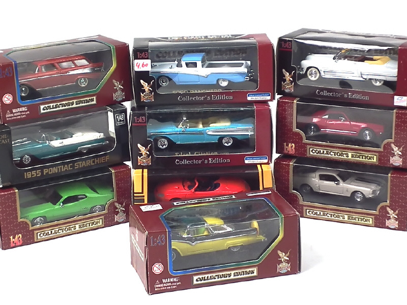 miniatures reproduisant les modèles : EDSEL, FORD (4 exemplaires différents), CHEVROLET (2 exemplaires différents), PLYMOUTH, PONTIAC & CADILLAC - on y retrouve les marques : YATMING, JOUEF EVOLUTION & NEW RAY - quelques boîtes en état 'c'