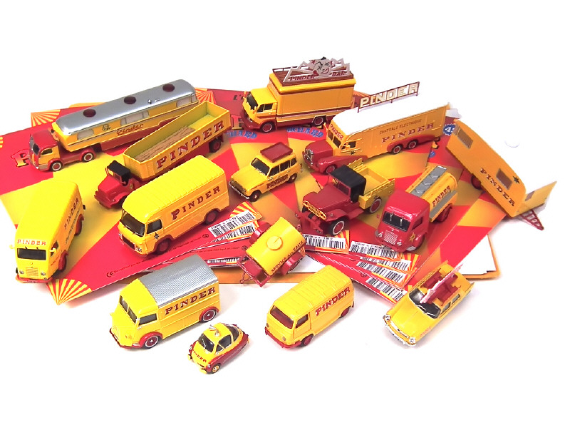 ALTAYA (ESPAGNE) Ensemble de 13 véhicules, une remorque & une caravane PINDER roue, jaune & gris métal
