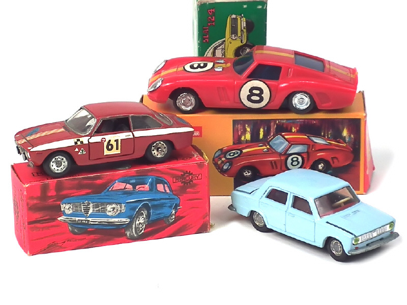 comprend : FERRARI 250 GTO (état 'A.b', moteur à friction fonctionne), SEAT 124 (état 'A-.c') & ALFA ROMEO GIULIA SPRINT GT (état 'R.b') - on y retrouve les marques : MERCURY, JOAL & LUCKY TOYS