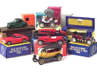 comprend : GAZ, CISITALIA, SPA, FIAT ELDRIDGE (saute-vent légèrement endommagé & petites inscriptions sur le plancher), 1901, TOPOLINO, 1911 (sans boîte) & BRIXIA ZUST - on y retrouve les marques : POLISTIL, JMK, BRUMM, GAMA, DUGU & SAFIR - on y joint 3 boîtes vides de la marque RIO