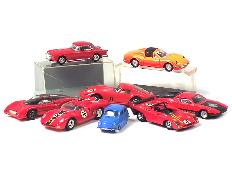 états de 'B' à 'R' - comprend : FERRARI 342 AMERICA, 246 GTS (carrosserie décolorée), 330 P2, P5, 250 GTO, 008, DE TOMASO PANTERA & FIAT 600 - on y retrouve les marques : CLE, JOUEF (voiture de circuit électrique), NOREV, RENWAL & ATKINSON - quelques décalques ajoutés - 2 modèles avec boîte