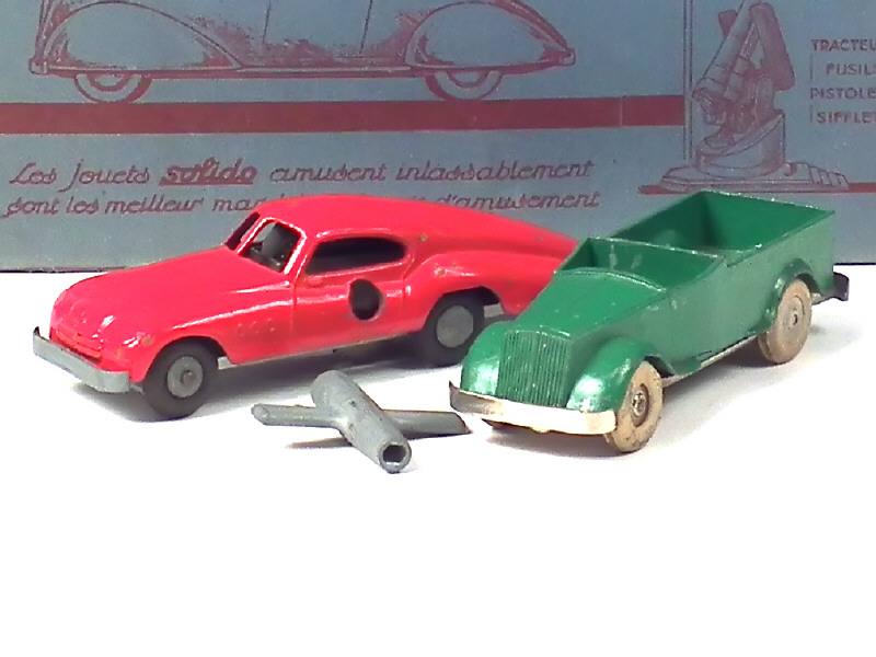 contient : voiture de course aérodynamique (état 'C' avec moteur fonctionnel & nombreux éclats majeurs) & pick-up (état 'D' avec importantes traces de métal fatigue sur la carrosserie avec 3 manques de matière) - avec clef - le coffret est en état 'c' (légèrement décoloré & taché)