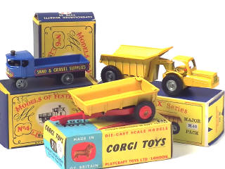 comprend : MASSEY FERGUSON remorque à un essieu (quelques traces d'oxydation), SENTINEL plateau à ridelles 'SAND & GRAVEL' & DINKUM tombereau articulé (état 'A-.b) - on y joint une boîte vide de BUGATTI type 35 (état 'b)