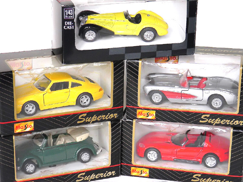 miniatures reproduisant les modèles : CHEVROLET CORVETTE, DODGE VIPER, PORSCHE CARRERA, VOLKSWAGEN COCCINELLE cabriolet & ALFA ROMEO 8C 2900 1938 - on y retrouve les marques : MAISTO & NEW RAY