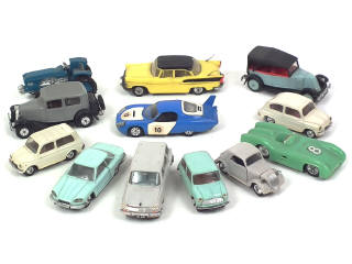 comprend : SIMCA 5, 1500 break, PANHARD 24 CT, DEUTSCH, RENAULT NN1, R86 (manque conducteur & plaque minéralogique), SIMCA BEAULIEU, MERCEDES-BENZ (manque saute-vent avec carrosserie décolorée), FIAT 600, 500 JARDINIERE, MORRIS 850 & CITROEN ROSALIE 1934 - quelques modèles en état 'C' - détails de peinture ajoutés sur certains exemplaires - carrosseries & jantes plus ou moins déformées & fondues
