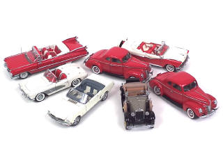 échelle 1/24ème - miniatures reproduisant les modèles : CADILLAC SERIES 62, CHEVROLET CORVETTE & FORD MODEL A, DELUXE coupé (2 exemplaires dont une avec suspensions arrière cassées), FAIRLANE & MUSTANG - quelques manques