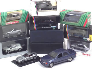 miniatures reproduisant les modèles : BMW (3 exemplaires différents), FORD (échelle 1/25ème, boîte état 'c'), MERCEDES BENZ (4 exemplaires différents) & VOLKSWAGEN (3 exemplaires différents) - on y retrouve les marques : SCHABAK, MINICHAMPS & HERPA