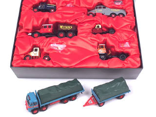 comprend : un coffret 'THE SCAMMELL STORY' (contenant 6 véhicules différents, avec certificat d'édition limitée numéroté 1435/1500 exemplaires) & ATKINSON plateau bâché avec remorque bâchée 'CROW'S' (collection THE SHOWMANS RANGE, avec certificat d'édition limitée numéroté 5574/14300 exemplaires, boîte en état 'c')