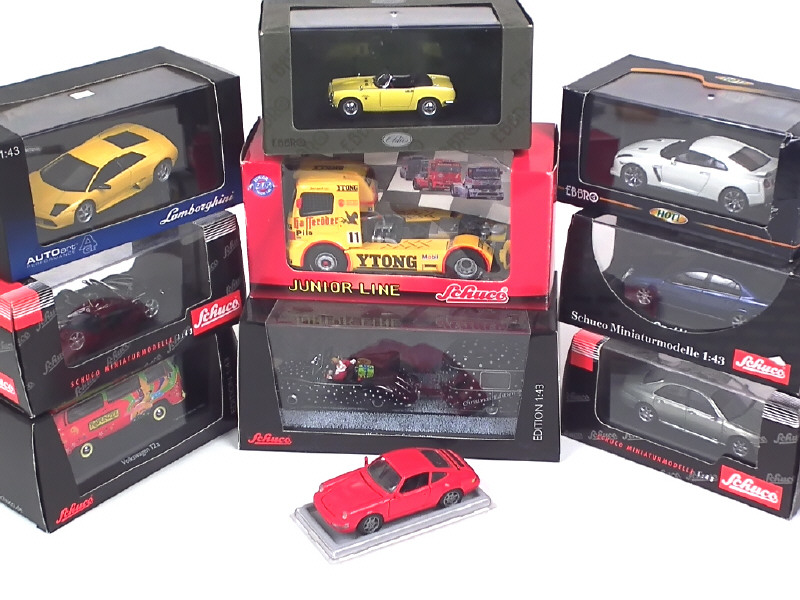 miniatures reproduisant les modèles : LAMBORGHINI, OPEL (2 exemplaires différents), VOLKSWAGEN, ROVER, MERCEDES, NISSAN, PORSCHE (état 'C'), TKW & HONDA - on y retrouve les marques : AUTOART, SCHUCO (dont un de la collection JUNIOR LINE (boîte en état 'c'), NZG & EBBRO (boîte en état 'c')