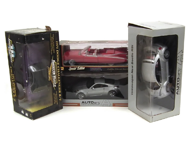 échelle 1/18ème - comprend : NISSAN Z, VOLKSWAGEN NEW BEETLE RCI, DODGE CHALLENGER 1971 (boîte en état 'c') & CADILLAC EL DORADO BIARRITZ (boîte en état 'c') - on y retrouve les marques : AUTOART, ERTL & MAISTO - blisters plus ou moins déformés