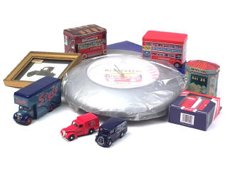 différentes échelles - comprend : MORRIS van 'PICKFORDS', BEDFORD fourgon 'STYLO', COMMER van 'SHARP'S' (état 'A-'), autobus à impériale 'DEWAR'S' (état 'F') & tacot en tôle - on y retrouve notamment la marque CORGI TOYS - on y joint 5 boîtes en tole lithographiée, une pendule RENAULT F1, un cadre avec pièces d'horlogerie représentant une FORD 1915 & un coffret contenant une boîte aux lettres & une cabine téléphonique britannique