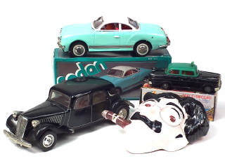 états de 'B' à 'D' - différentes échelles - comprend : VOLKSWAGEN KARMANN GHIA (moteur à friction fonctionne, avec bruiteur), CITROEN TRACTION (moteur à piles non testé) & MERCEDES taxi (moteur à friction fonctionne) - on y retrouve les marques : NEW TOY, BOMAN & PEPE - on y joint un visage en plâtre de Groucho MARX - 2 modèles avec boîte - quelques manques & taces d'oxydation