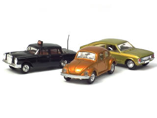 comprend : MERCEDES 220 S 'TAXI' (petits détails de peinture ajoutés, suspension arrière affaissée), FORD CONSUL GT & VOLKSWAGEN 1302