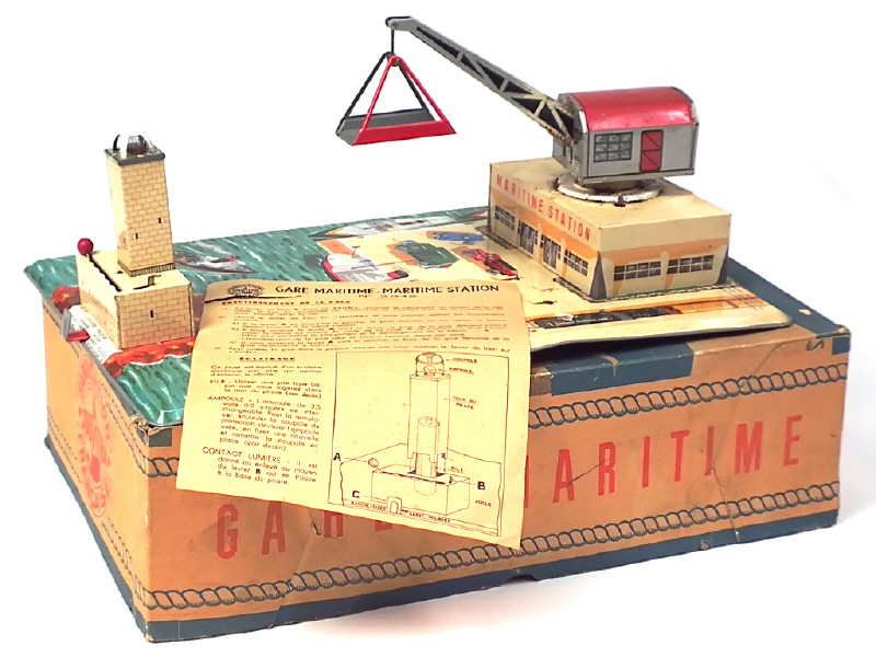 dimensions : 37 x 25 cm - moteur à clef (à revoir) - un levier de commande permet de faire marcher la grue dans tous les sens - phare électrique (non testé) - importantes traces d'oxydation & d'humidité sur la base & la flêche de la grue - avec notice