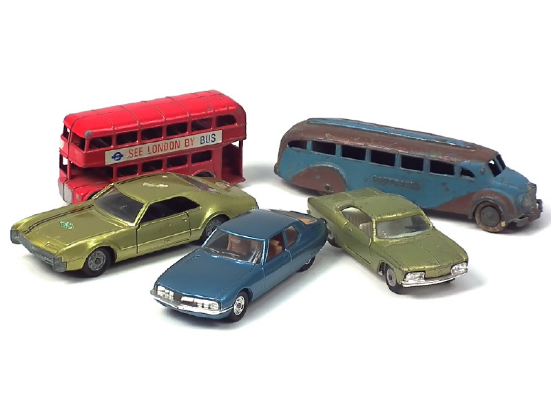 comprend : CITROEN SM (état 'A'), CHEVROLET CORVAIR (état 'E'), OLDSMOBILE TORONADO (état 'C', parties chromées ternies, décalques ajoutés, voalnt manquant), ROUTEMASTER autobus londonnien (état 'E) & autocar 'GREYHOUND' (état 'R', pneus endommagés) - on y retrouve les marques : SOLIDO, GAMDA KOOR, LONE STAR & TOOTSIETOY
