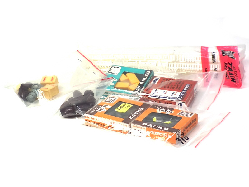 comprend : barrières (pour train électrique HO), sacs, bottes de paille, bidons à lait, tonneaux & caisses - on y retrouve les marques : DINKY TOYS FRANCE (2 caisses retouchées), BRITAINS & JOUEF