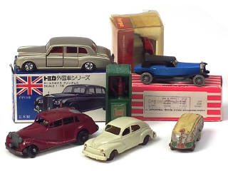 petites échelles - états de 'A' à 'D' - comprend : ROLLS ROYCE PHANTOM II (boîte en état 'b'), PHANTOM VI (boîte en état 'b'), SILVER GHOST (moteur à clef à revoir - quelques petites restaurations), FERRARI F40 (boîte en état 'b'), PEUGEOT 203 (quelques fêlures) & autocar de voyage (en état 'E' avec parties non d'origine) - on y retrouve notamment les marques : TOMICA DANDY, ANGUPLAS, CLE, HERPA & MINIC - on y joint un distributeur à essence 'CASTROL' de réalisation anglaise (en état 'd', petits manques)