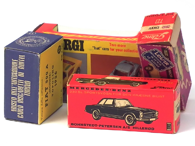 on y retrouve les marques : TEKNO (référence 928, avec notice, 727, état 'c'), CORGI TOYS (référence 167) & DUGU (référence 13)