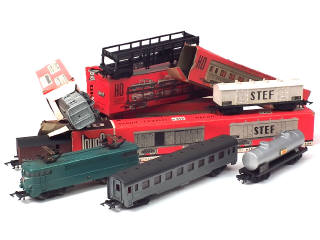états de 'A' à 'C' - comprend : motrice électrique BB 9201 'SNCF' (non testé), voiture de voyageurs (3 exemplaires différents) & wagon (5 exemplaires différents) - quelques manques & traces d'oxydation - 5 modèles en boîtes (états de 'c' à 'd')