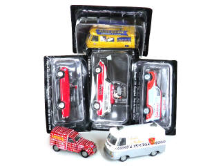 miniatures reproduisant les modèles : PEUGEOT 203 fourgonnette, PEUGEOT 403, PEUGEOT J7, CITROEN ID19 & CITROEN 2CV - 2 modèles sans boîte