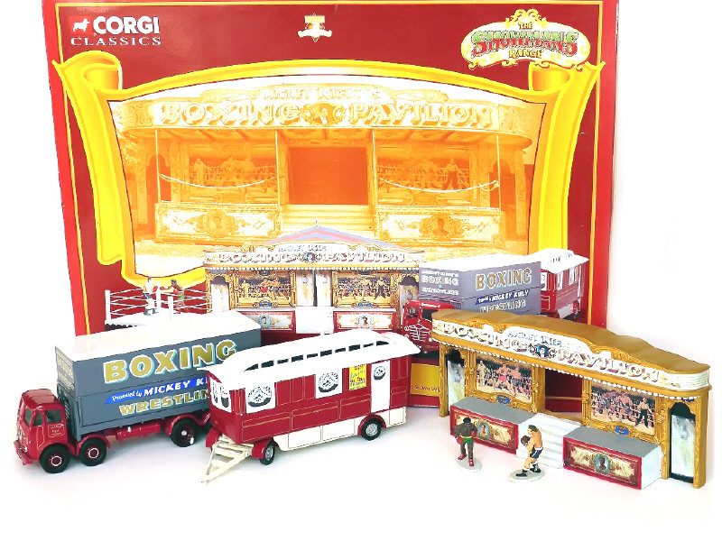 série 'CORGI CLASSICS' - contient : un FODEN FG POLE avec caravane, un ring en carton, une façade de parade & 2 boxeurs
