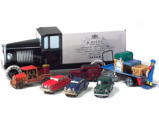 états de 'A' à 'D' - comprend : camion en tôle 'MEERT' (longueur : 30 cm), chariot de gare en tôle (moteur à clef fonctionne), 2 voitures de circuit (moteurs à clef fonctionnent), camion de pompiers (RARE), FORDSON van 'EBBEY COLOR' & MORRIS MINOR - on y retrouve notamment les marques : CORGI TOYS, PAYA, ELI & MS - quelques traces d'oxydation