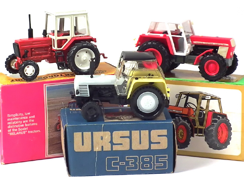 comprend : BELARUSSE (boîte en état 'c'), ZETOR CRYSTAL (échappement à recoller) & URSUS C385 - on y retrouve les marques : TRAKTOEXPORT, ESTETYKA & IGRA