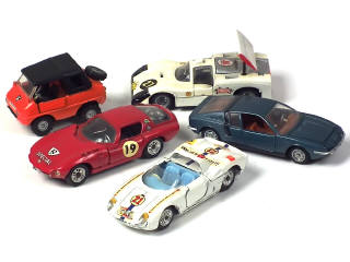 états de 'B' à 'D' - comprend : RANGER FERVES, MATRA 530 VIGNALE, ALFA ROMEO GIUILIA BERTONE, FERRARI & CHAPARRAL (état 'R') - on y retrouve les marques : MERCURY & MEBETOYS - quelques petits manques - détails de peinture & décalques ajoutés