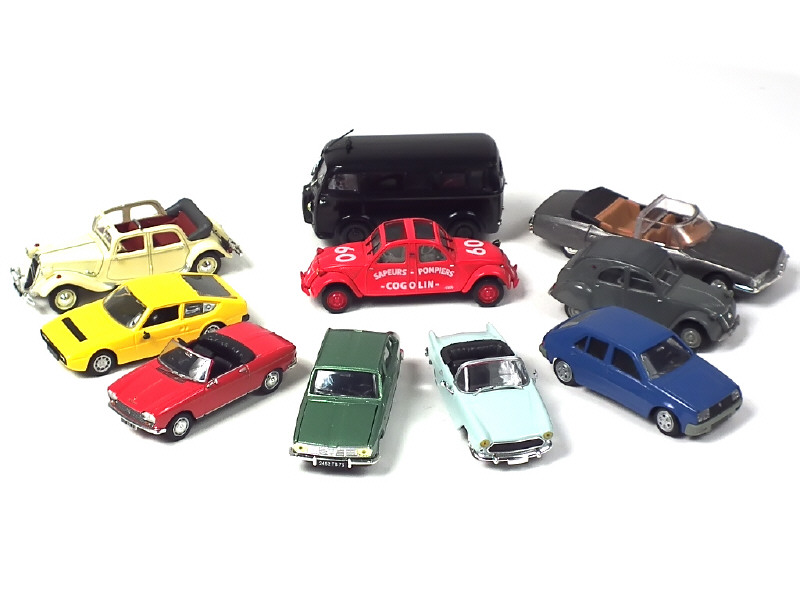 certains modèles vendus en kiosque - miniatures reproduisant les modèles : PEUGEOT (2 exemplaires différents), SIMCA (2 exemplaires différents), CITROEN (4 exemplaires différents dont un en état 'B' avec parties cassées & manquantes) & RENAULT (2 exemplaires différents)