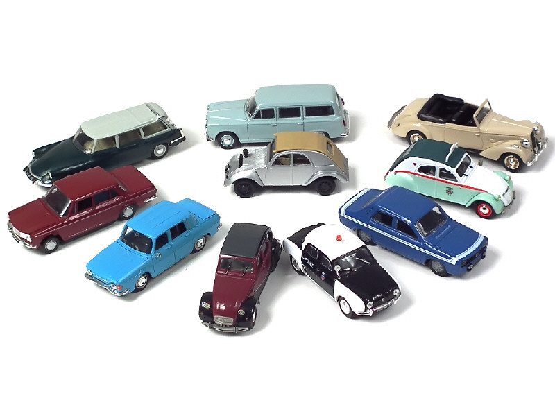 certains modèles vendus en kiosque - miniatures reproduisant les modèles : CITROEN (4 exemplaires différents), PEUGEOT, RENAULT (3 exemplaires différents), SIMCA (importantes traces de métal fatigue sur le plancher avec déformations) & HOTCHKISS