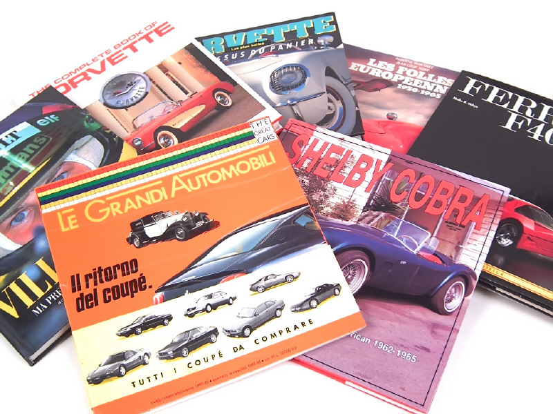 comprend : CORVETTE, LES FOLLES EUROPEENNES, GRAND PRIX, FERRARI, SHELBY COBRA, VILLENEUVE, VOITURES DE COURSES (écrits en français), CORVETTE (en anglais) & LE GRANDI AUTOMIBILI (en italien & en anglais)