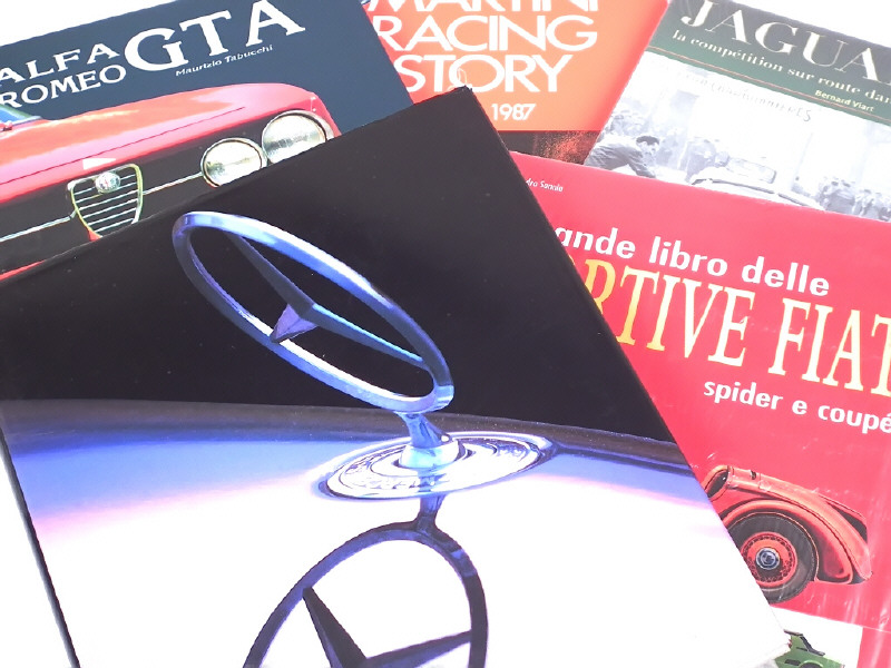 comprend : JAGUAR XK (sous film plastique jamais ouvert), MARTINI RACING STORY (écrits en français), ALFA ROMEO GT, SPORTIVE FIAT (sous film plastique jamais ouvert, ouvrages écrits en italien) & MERCEDES (en anglais, français & allemand)