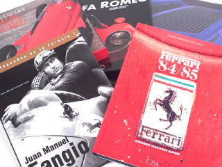 comprend : ALFA ROMEO (en coffret cartonné), FANGIO (livres écrits en français), LEGENDARIE ALFA ROMEO (en coffret cartonné, en italien), FERRARI 84-85 (en anglais, français & italien) & PORSCHE (en anglais, français & allemand, sous film plastique jamais ouvert)