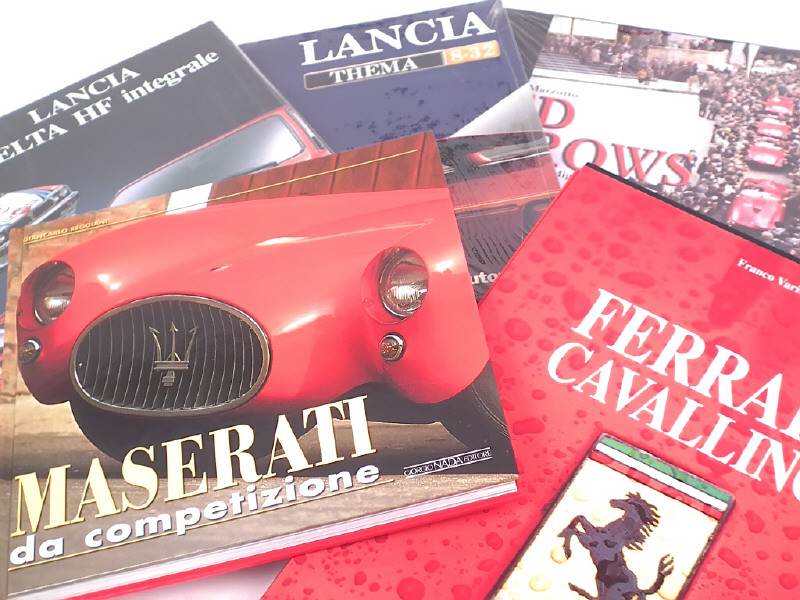 comprend : FERRARI CAVALLINO (en coffret cartonné, en français), MASERATI, LANCIA THEMA & DELTA HF (sous film plastique jamais ouvert, ouvrages écrits en italien) & RED ARROWS FERRARI AT THE MILLE MIGLIA (sous film plastique jamais ouvert)